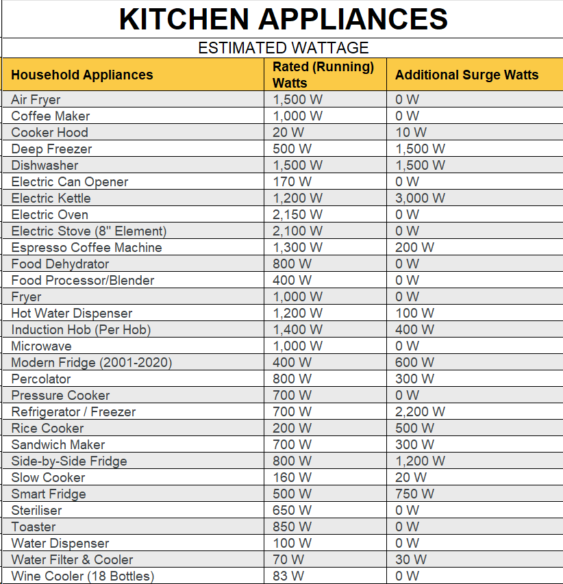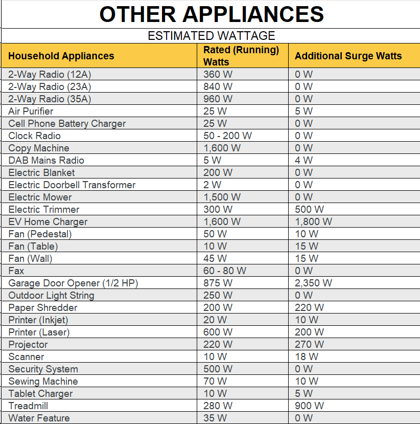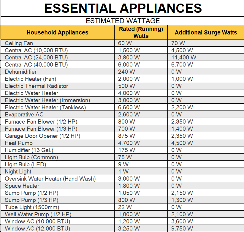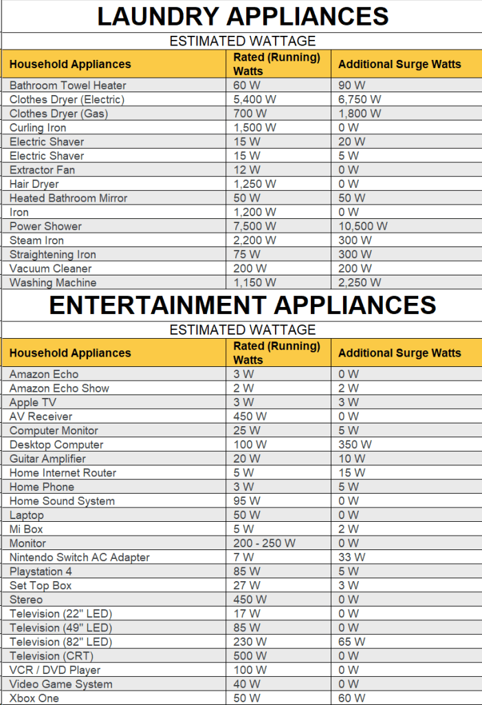 Typical Household Appliance Wattage Loads